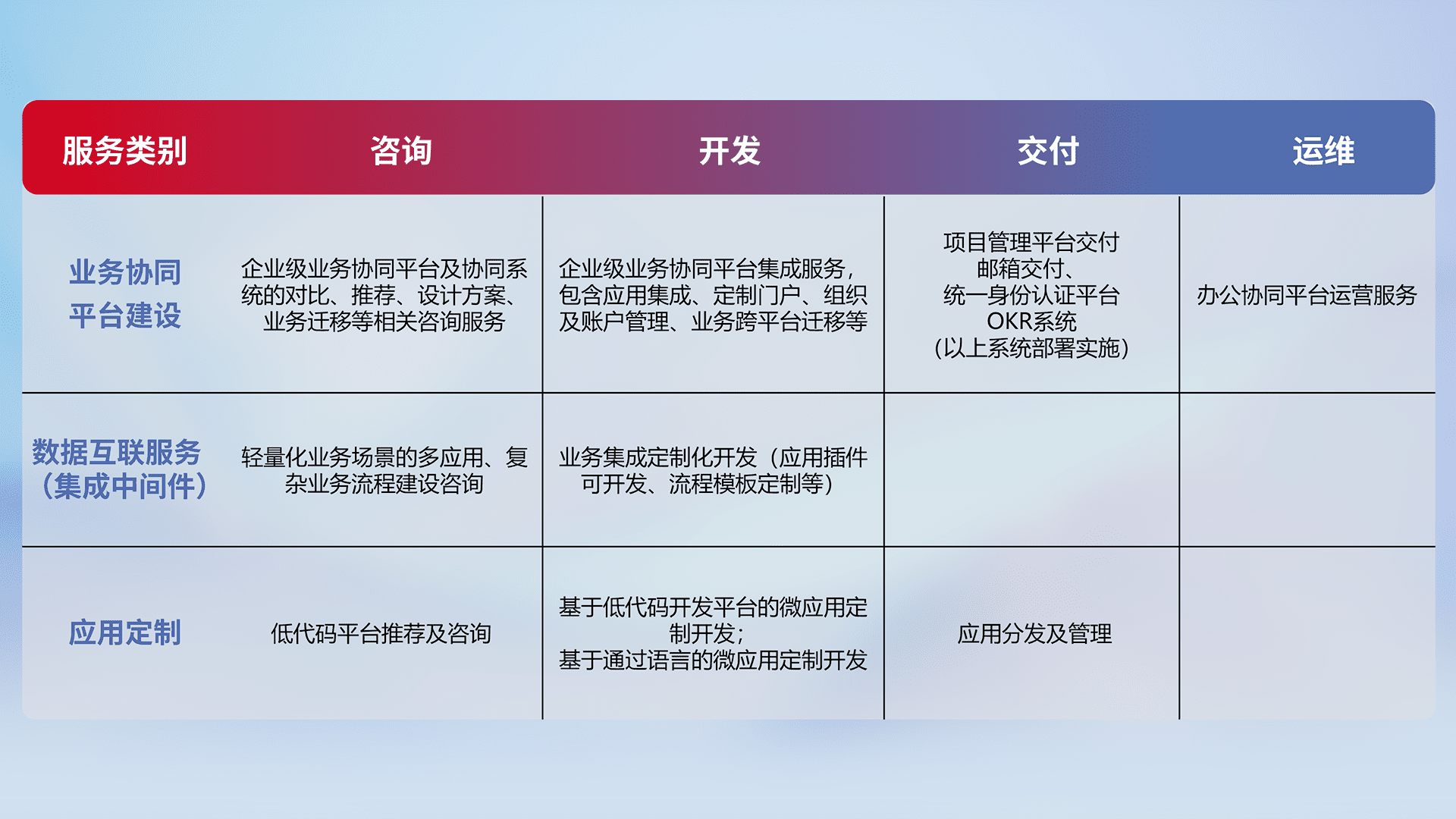 针对钉钉、、、、企微、、IDaas等平台级产品提供产品的规划、、方案、、交付、、、定制化开发等服务,,,,实现如统一协同办公、、、智能客户服务、、、、混合会议管理、、智能数据查询、、等业务场景,,,实现数字化转型。。。