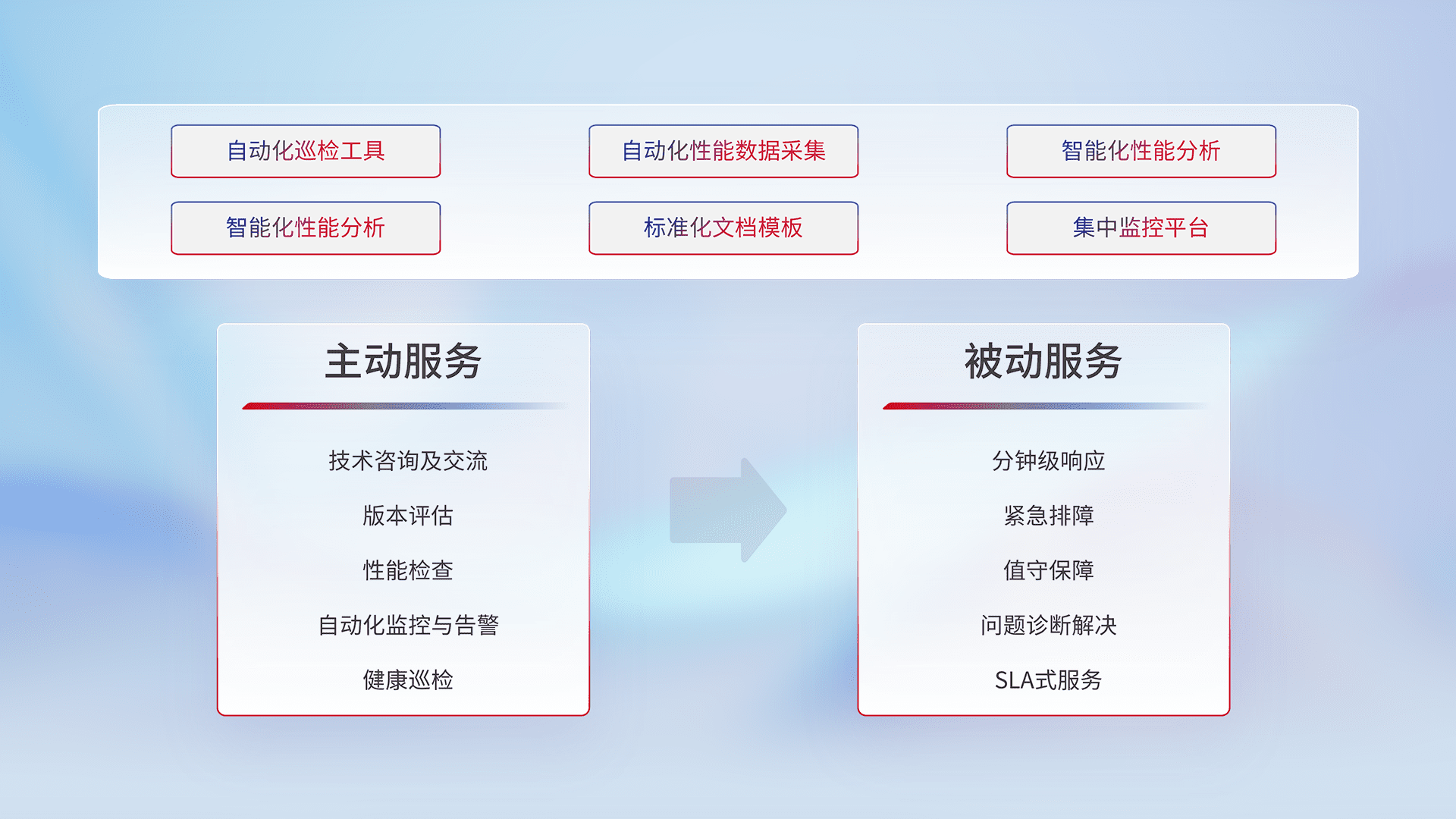 智能化工具和标准化文档,,,,保障服务质量,,,,提供主动服务(包含技术咨询、、、、版本评估、、、、性能检查、、、自动化监控与告警、、、健康巡检)和被动服务包含(分钟级响应、、、、紧急排障、、、值守保障、、、问题诊断解决、、SLA服务)。。。。